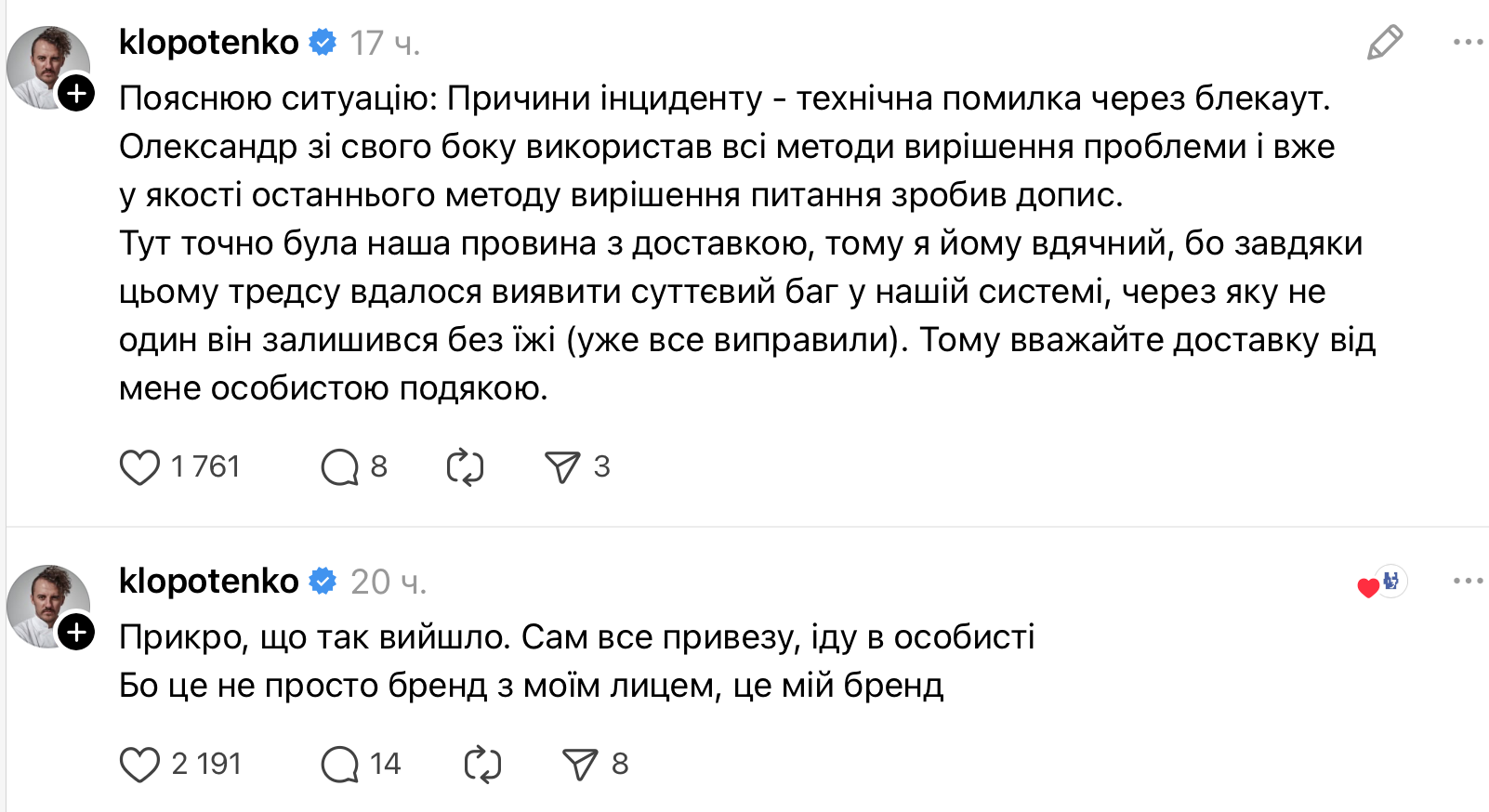 "Тут точно була наша провина з доставкою, тому я йому вдячний, бо завдяки цьому вдалося виявити суттєвий баг у нашій системі, через який не один він залишився без їжі (уже все виправили). Тому вважайте доставку від мене особистою подякою", – написав Клопотенко.