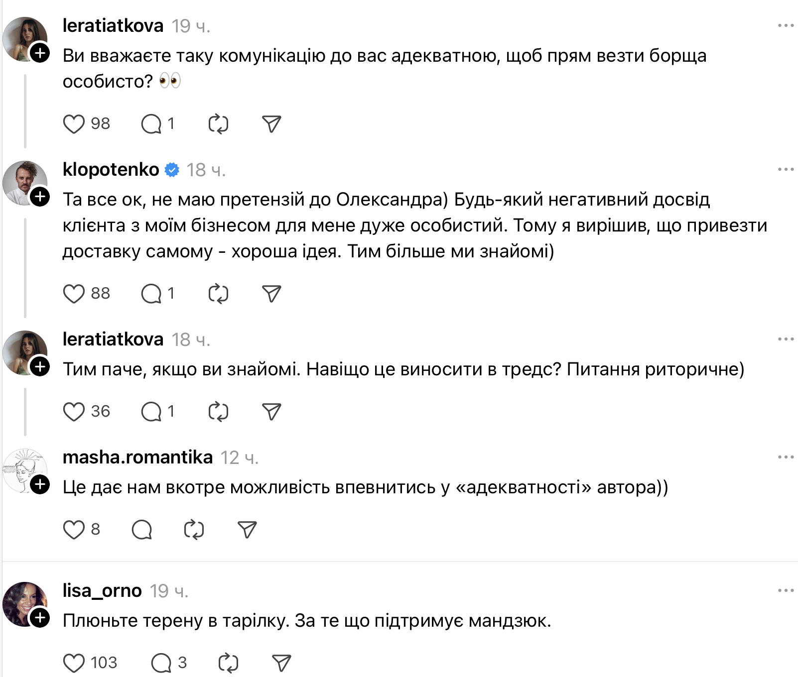 Також Клопотенко відповів на запитання користувачки щодо тону звернення Терена, зазначивши, що не має до нього жодних претензій і сприймає ситуацію як власну відповідальність бізнесу.