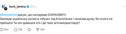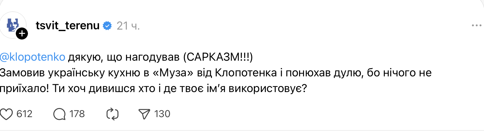 "Дякую, що нагодував (сарказм!). Замовив українську кухню в "Музі" від Клопотенка і понюхав дулю, бо нічого не приїхало! Ти хоч дивишся, хто і де твоє ім'я використовує?", – написав ветеран війни.