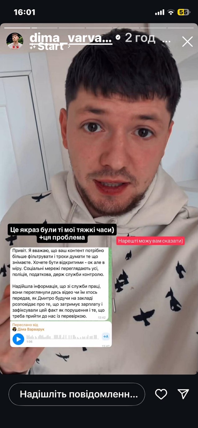 Блогер розповів у Instagram, що дізнався про вимагання грошей від керівника закладу, який повідомив про візит представників Держпраці. За словами Варварука, посадовці скористалися складним фінансовим періодом компанії та публічністю власника, натякаючи на можливі проблеми у разі відмови "домовитися".