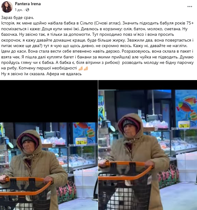 "Розраховуюсь, вона склала в пакет і взята чек. Я пішла далі купляти багет і банани за якими прийшла, але чуйка не підводить. Думаю, пройдусь гляну, чи є бабка. А бабка є, біля вітрини з рибою. Розводить молоду не бідну парочку на рибу. Копчену першої необхідності. Ну я, звісно, їм сказала. Афера не вдалась", — додає авторка історії.