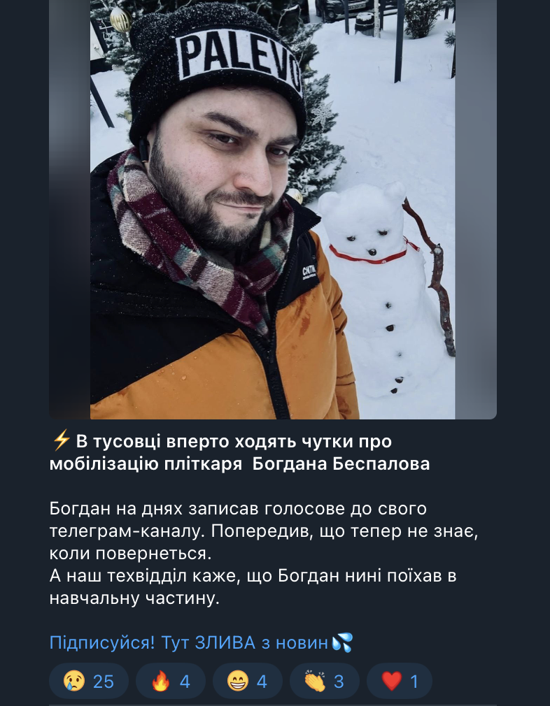 "В тусовці вперто ходять чутки про мобілізацію пліткаря Богдана Беспалова. А наш техвідділ каже, що Богдан нині поїхав в навчальну частину", — зазначили журналісти "Зливи".