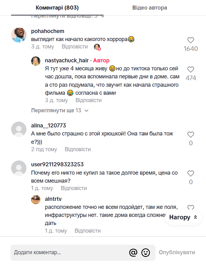 "Я тут вже 4 місяці живу, але до TikTok тільки зараз дійшла, поки згадувала перші дні в будинку. Сама сто разів подумала, що це звучить, як початок страшного фільму. Згодна з вами", — відповіла авторка ролика на останній коментар.