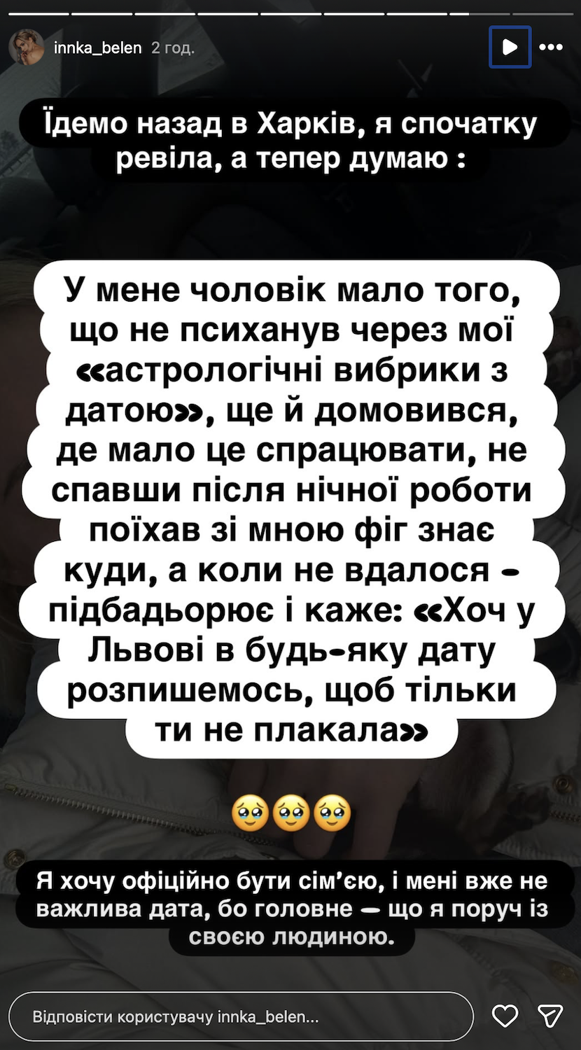 У понеділок, 2 лютого, дівчина вийшла на зв’язок із підписниками у сльозах. Інна розповіла у своєму Instagram-акаунті, що планувала офіційно стати дружиною саме цього дня, адже їй дуже подобалася дата 02.02.2026. Однак здійснити задум завадили юридичні обставини, пов’язані з її попереднім шлюбом, оформленим за кордоном.