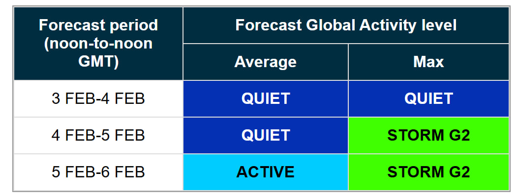Прогноз глобальної геомагнітної активності Британської геологічної служби свідчить, що в період з 4 по 5 лютого середній рівень збурень залишатиметься на позначці "помірний", однак максимальні значення можуть досягати STORM G2. Вже з 5 на 6 лютого середній рівень активності прогнозують як "активний", при цьому пікові показники знову можуть відповідати рівню STORM G2.