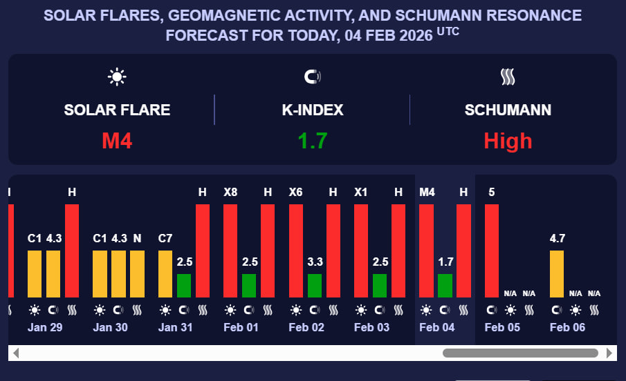 За їхніми даними, 4 лютого очікується магнітна буря зеленого рівня з К-індексом 1,7. Попри тимчасове зниження активності, Сонце залишається у фазі підвищеного збурення. Науковці відстежують єдиний корональний викид маси, спрямований у бік Землі. Він пов’язаний із потужним сонячним спалахом класу X8.1, який стався 1 лютого.