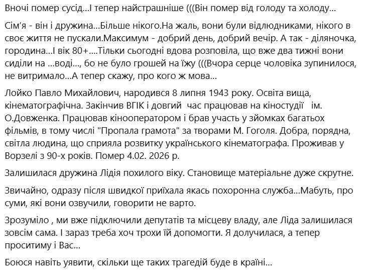 "Сталася трагедія. Чесно кажучи, в мене навіть слів не вистачає, але я маю звернутися до вас, друзі. Вночі помер сусід…І тепер найстрашніше. Він помер від голоду та холоду… Сімʼя — він і дружина…Більше нікого. На жаль, вони були відлюдниками, нікого у своє життя не пускали. Максимум — добрий день, добрий вечір. А так — діляночка, городина. Вік 80+. Тільки сьогодні вдова розповіла, що вже два тижні вони сиділи на… воді, бо не було грошей на їжу. Вчора серце чоловіка зупинилося, не витримало", — поділилась подробицями жінка.