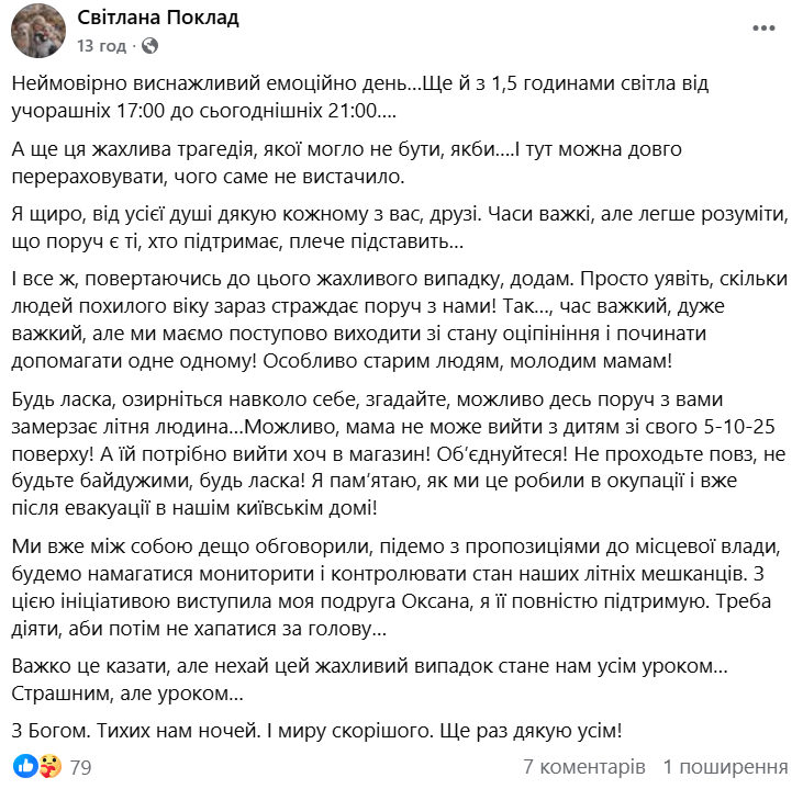 "Я щиро, від усієї душі дякую кожному з вас, друзі. Часи важкі, але легше розуміти, що поруч є ті, хто підтримає, плече підставить…І все ж, повертаючись до цього жахливого випадку, додам. Просто уявіть, скільки людей похилого віку зараз страждає поруч з нами! Так, час важкий, дуже важкий, але ми маємо поступово виходити зі стану заціпеніння і починати допомагати одне одному! Особливо старим людям, молодим мамам!" — підсумувала пані Поклад.