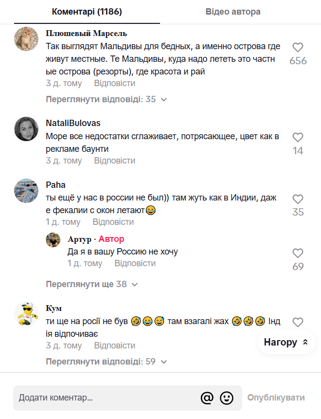 - "Так виглядають Мальдіви для бідних, а саме острови, де живуть місцеві. Ті Мальдіви, куди треба летіти, це приватні острови (курорти), де краса і рай", — прокоментувала одна глядачка.