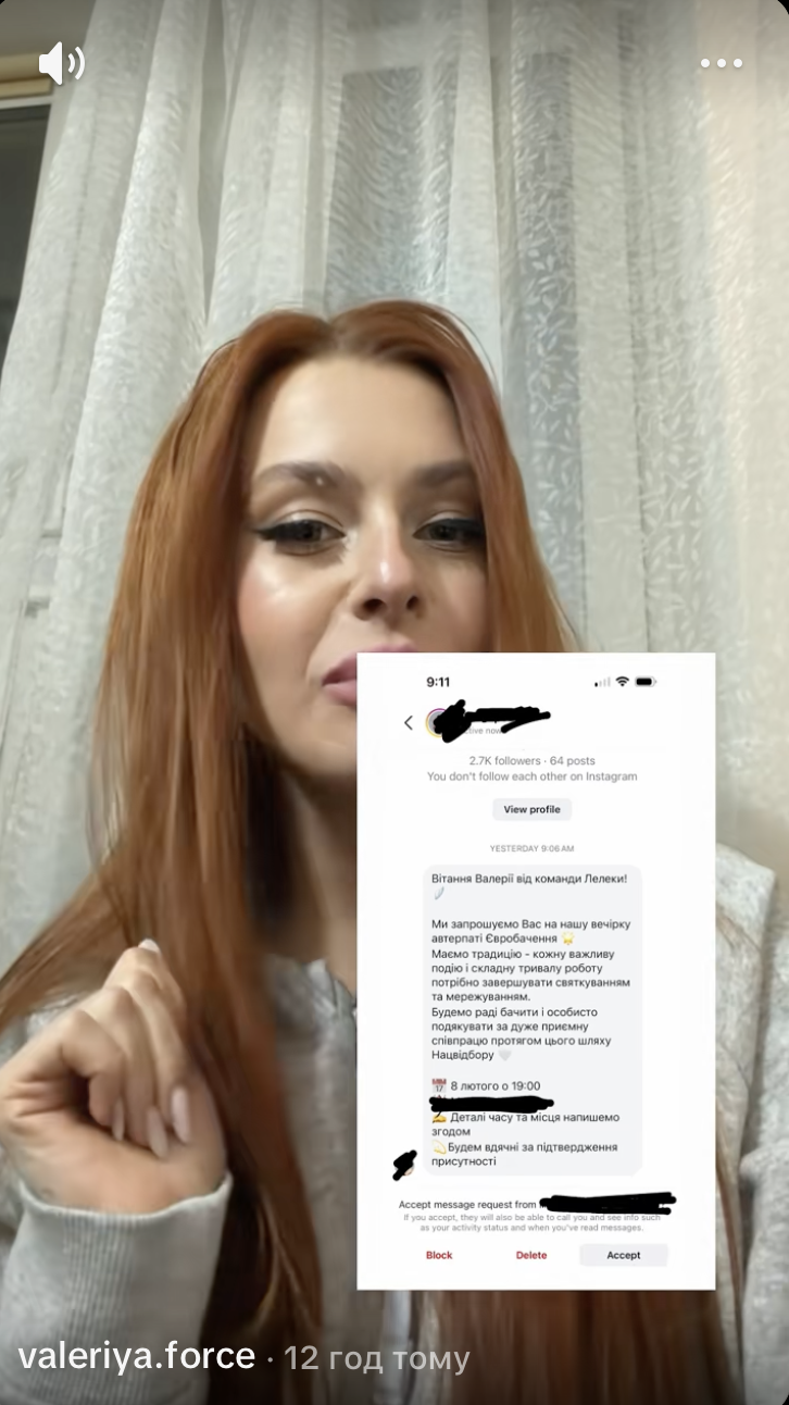 "Вчора 7 лютого о 18:00 команда Leléka запросила мене на її афтер-паті. Ось скрін. Скрін був зроблений за часом у Нью-Йорку. А сьогодні це запрошення вже видалили. В мене, на жаль, не вийшло піти на святкування, бо запрошення видалили, то ж з такої нагоди я пропоную зробити афтер-паті для учасників, які не поїдуть у Відень. Що ви думаєте з цього приводу?" — сказала Valeriya Force.