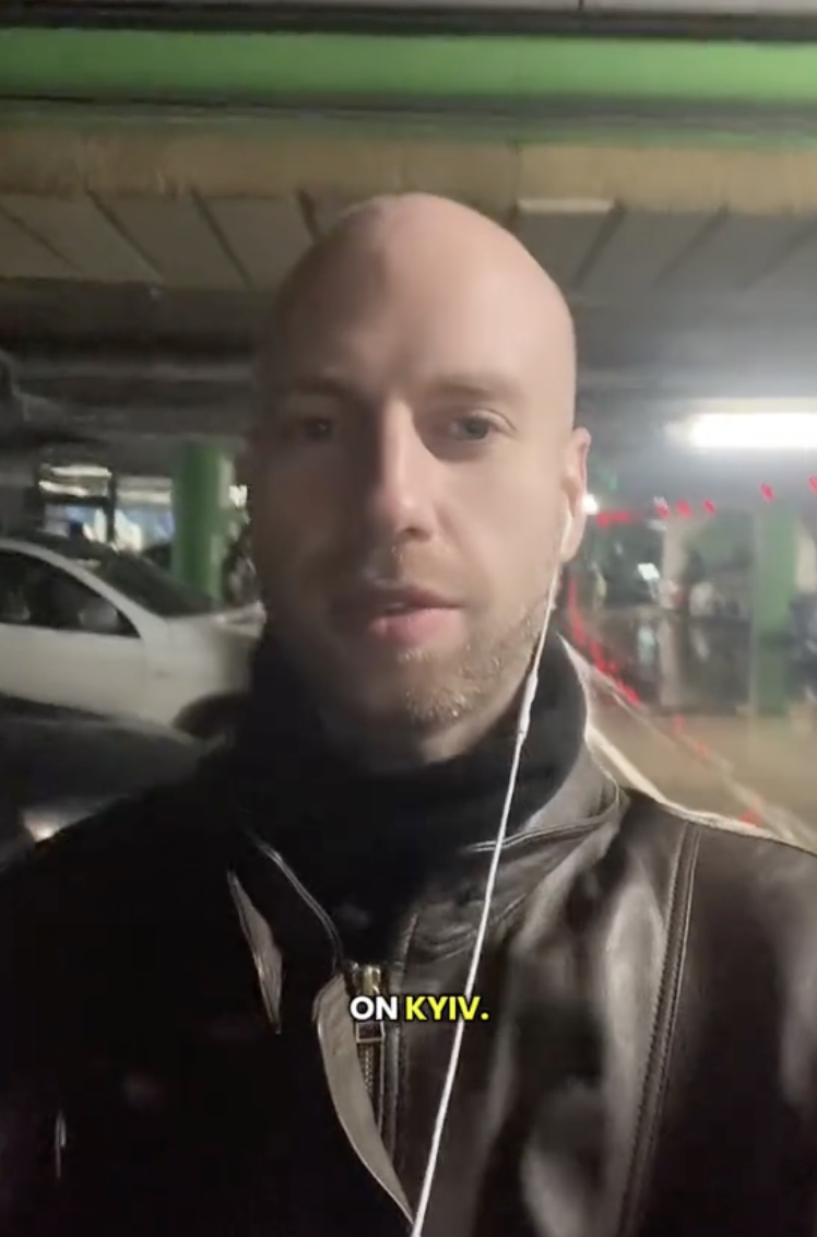 "Чергова сирена. Ракети летять на Київ. Ракетна атака на Київ, тому ми чекаємо в підземеллі торгового центру. Шопінг перетворився на очікування на підземній парковці. Очікуємо спокійно, поки божевілля закінчиться. Але воно ніколи не закінчується тут", — сказав іноземець.
