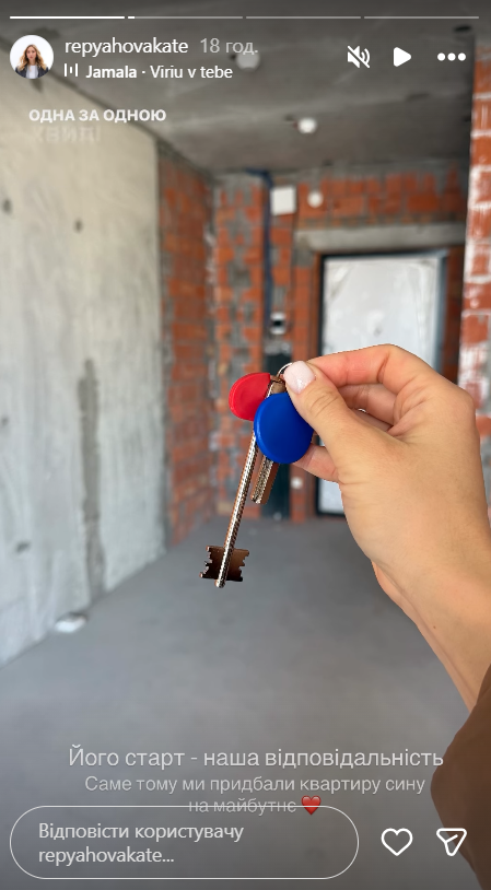 "Здійснилася моя мрія! Його старт – наша відповідальність. Саме тому ми придбали квартиру сину на майбутнє", — написала вона та показала фото ключів на тлі стін нової оселі.