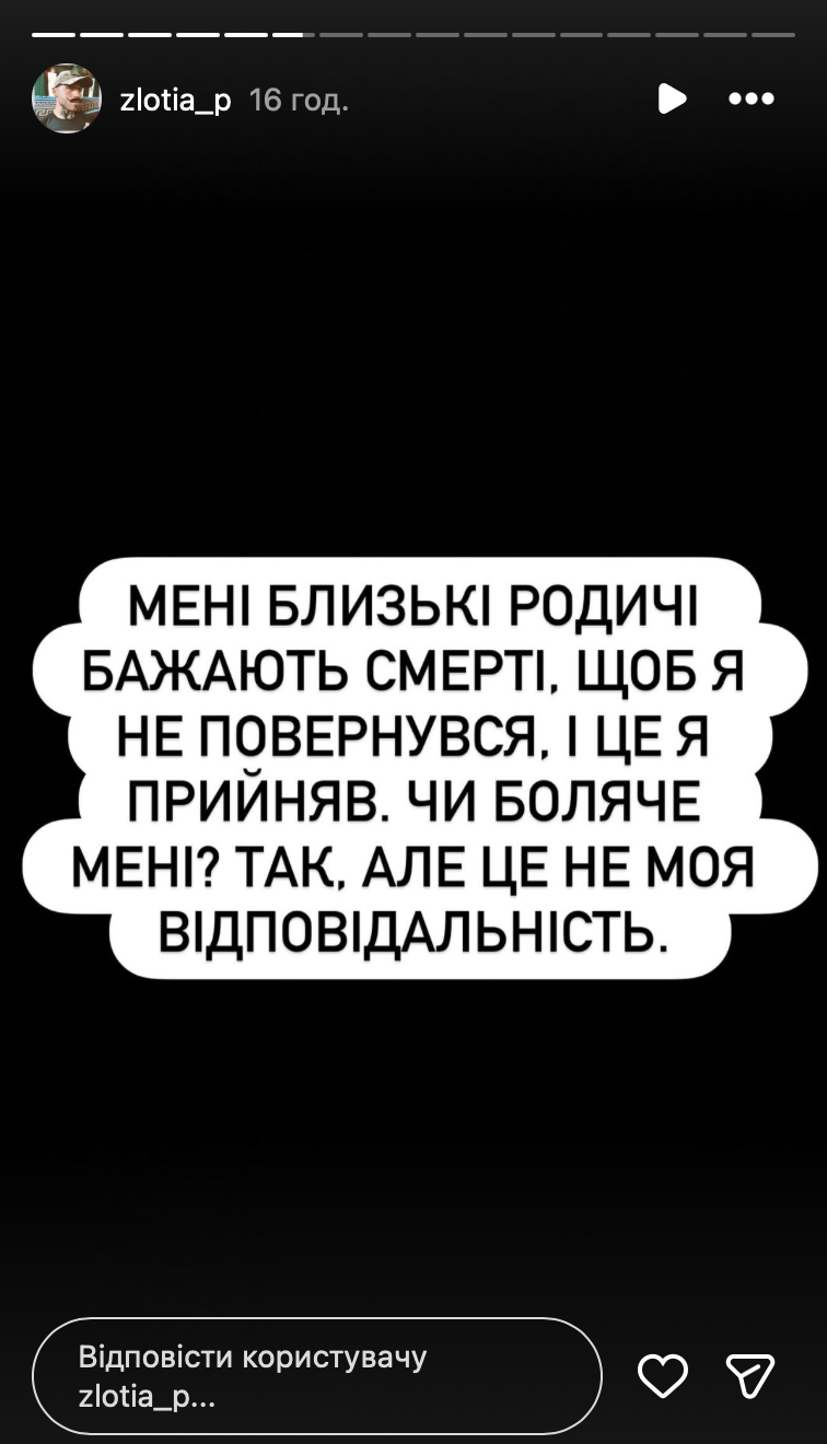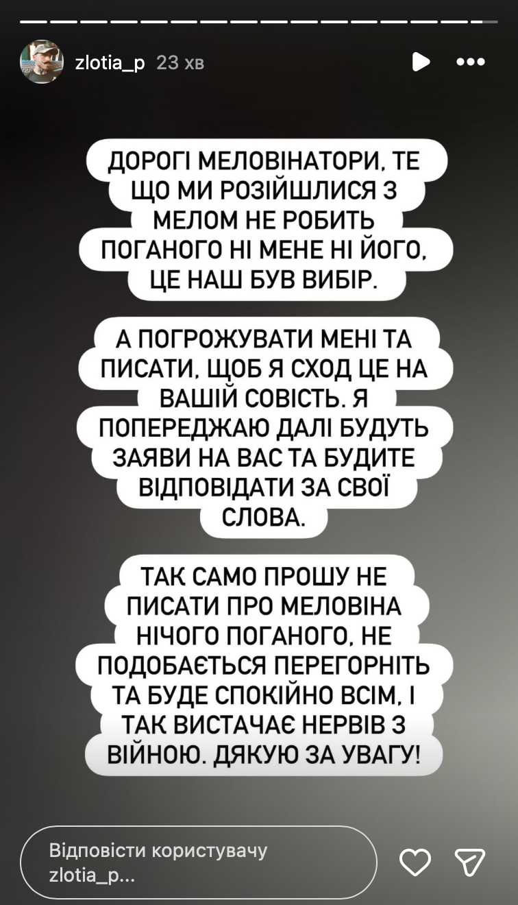Колишній наречений українського співака Меловіна, парамедик ЗСУ Петро Злотя, емоційно висловився про їхнє розставання. До того ж, він попросив фанатів артиста не писати йому критики та прокльонів.