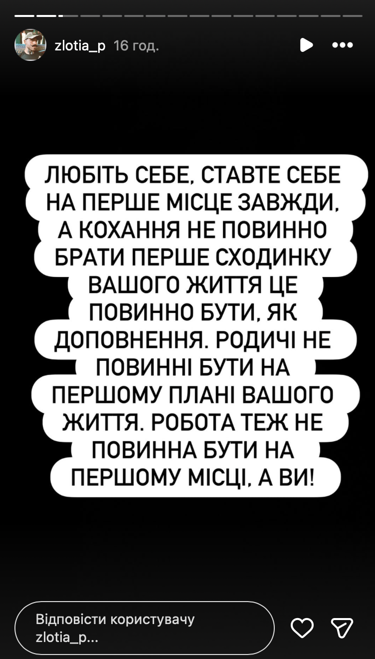 "А кохання не повинно брати першу сходинку — це має бути доповненням. Родичі не повинні бути на першому плані вашого життя. Робота теж не повинна бути на першому місці, а ви", — зазначив Петро.