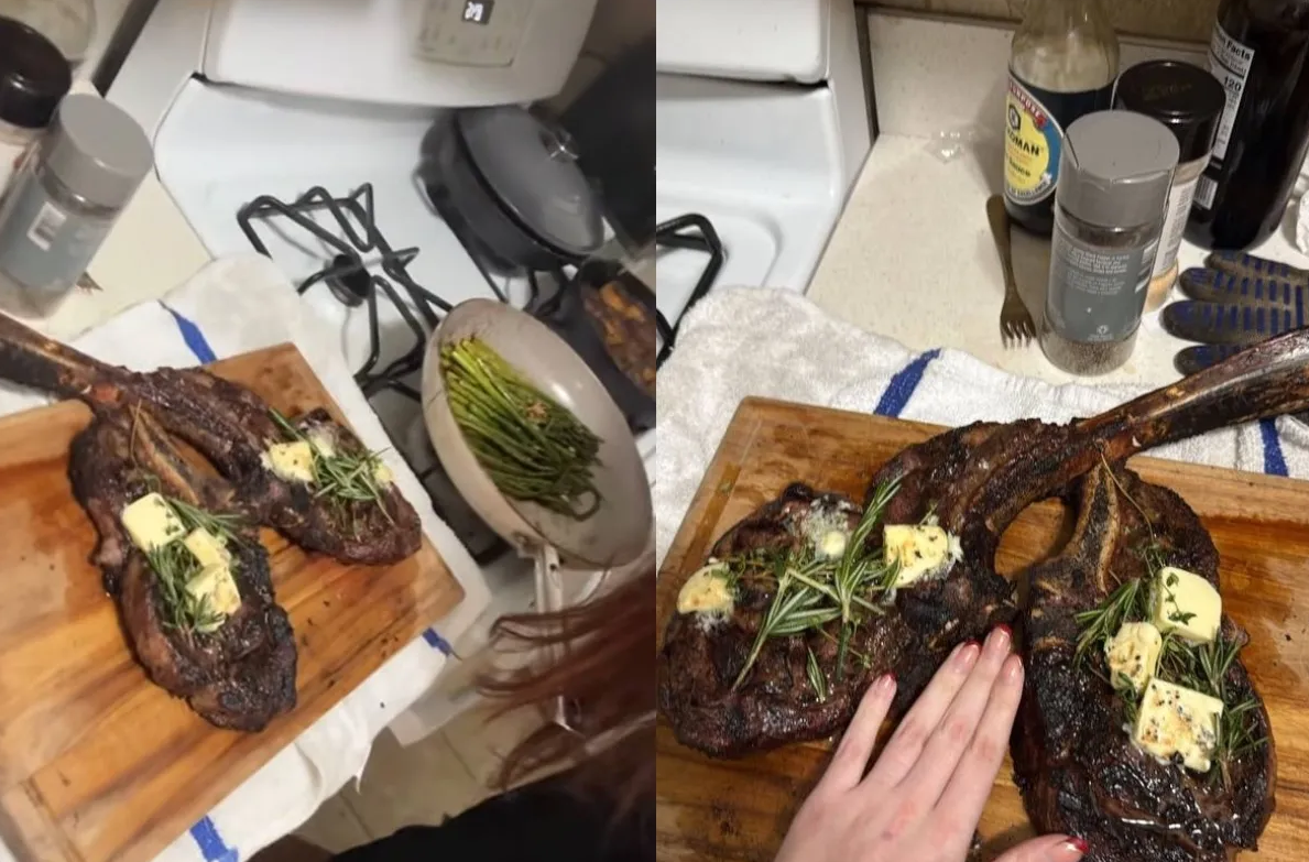 "Друзі, подивіться просто, що мій чоловік сьогодні приготував нам на 14 лютого. У нас тут якийсь дуже гарний стейк, моя улюблена спаржа та запечена картопелька. Ви просто подивіться на розмір цього стейка!" — розповіла Маша.