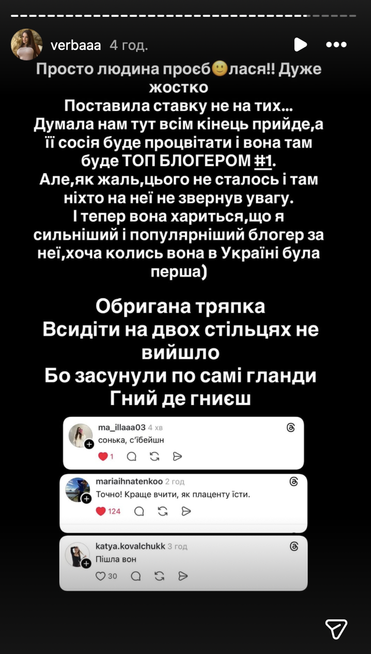 "Просто людина про**алась. Дуже жорстко. Поставила ставку не на тих. Думала, нам тут всім кінець прийде, а її Росія буде процвітати і вона там буде топблогером. Але цього не сталось. А тепер вона хариться, що я сильніший і популярніший блогер за неї, хоча колись вона в Україні була перша. Всидіти на двох стільцях не вийшло", — додала Верба.