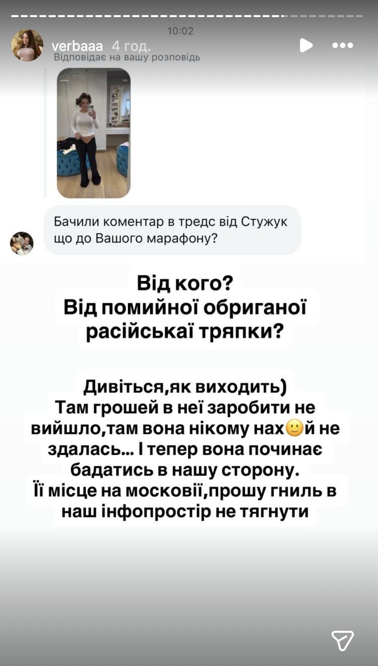 Блогерка мовчати на стала та відповіла Стужук різким тоном. В Instagram Верба написала, що думає про блогерку з України.
