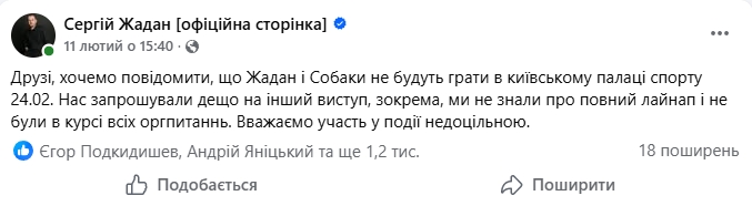 Сергій Жадан повідомив, що 24 лютого виступати не буде