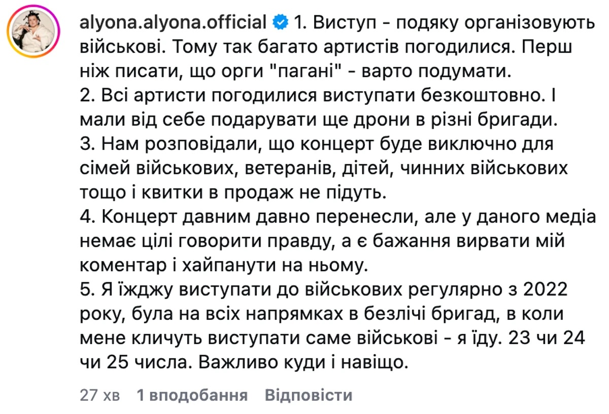 А реперка alyona alyona у пості, який зараз недоступний, або видалений, зауважила, що концерт мав допомогти військовим: "Виступ-подяку організовують військові. Тому так багато артистів погодилися. Перш ніж писати, що орги "пагані" – варто подумати. Всі артисти погодилися виступати безкоштовно. І мали від себе подарувати ще дрони в різні бригади", – прокоментувала вона.