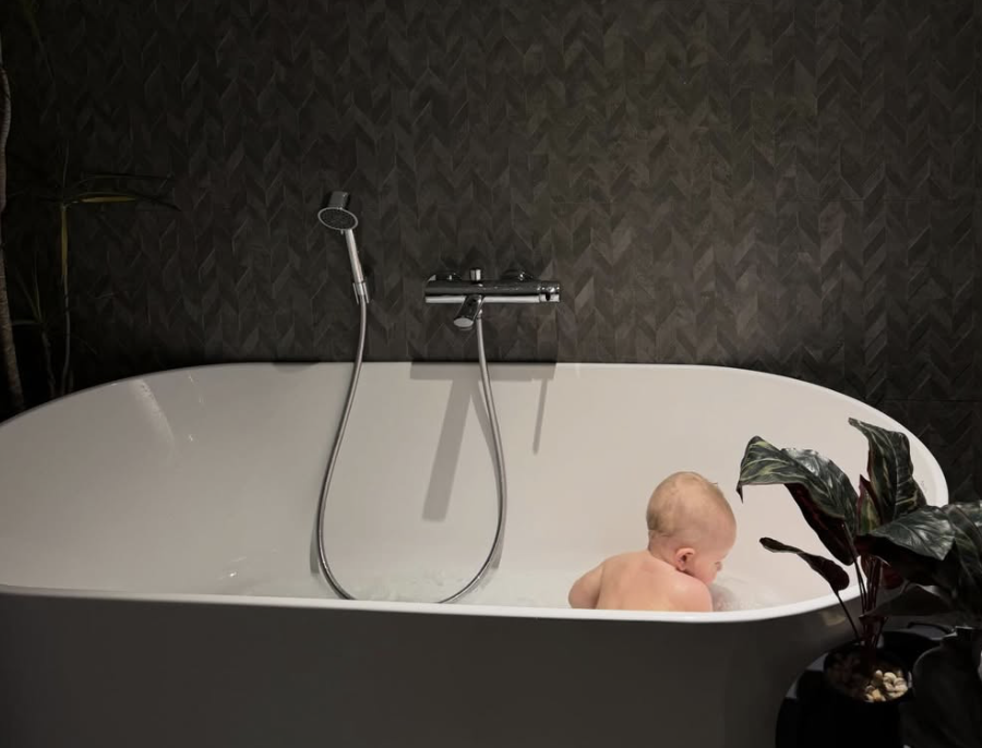 На першому фото малюк приймав ванні процедури та традиційно був повернутий обличчям від камери, адже батьки оберігають приватність дитини.