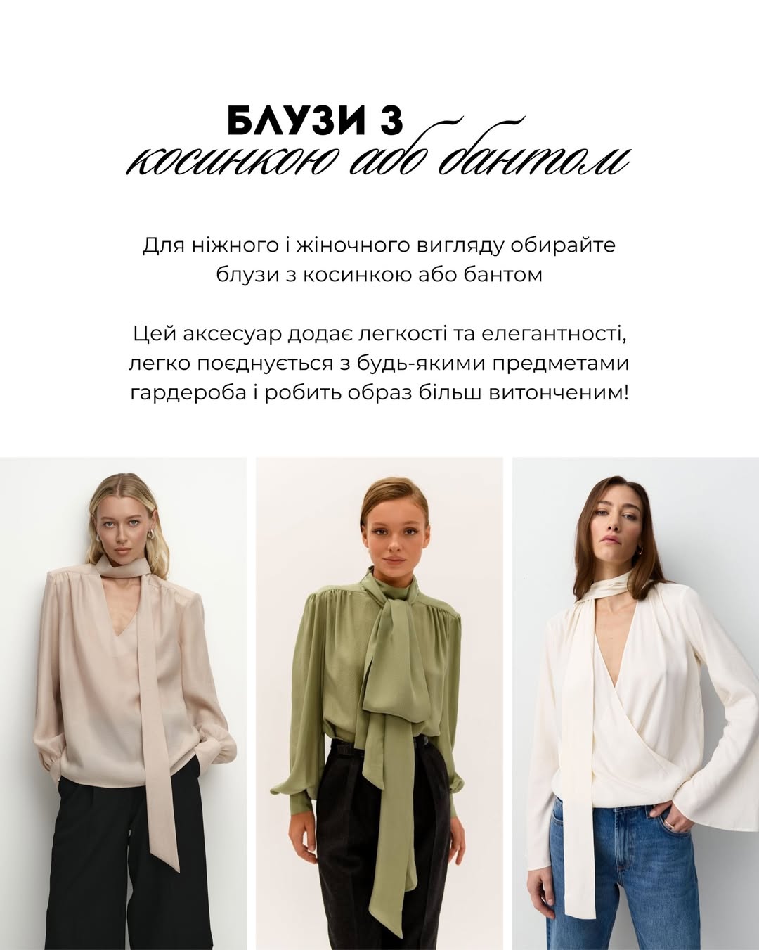 Ще один must-have — блузи зі стійкою, які часто виготовляють із шифону або сатину. Такі моделі надають образу легкості й однаково добре поєднуються як із класичними брюками, так і з джинсами.