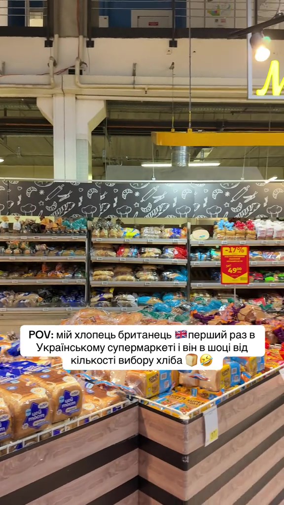 "POV: мій хлопець британець перший раз в українському супермаркеті й він в шоці від кількості вибору хліба", — пише авторка в описі до відео.