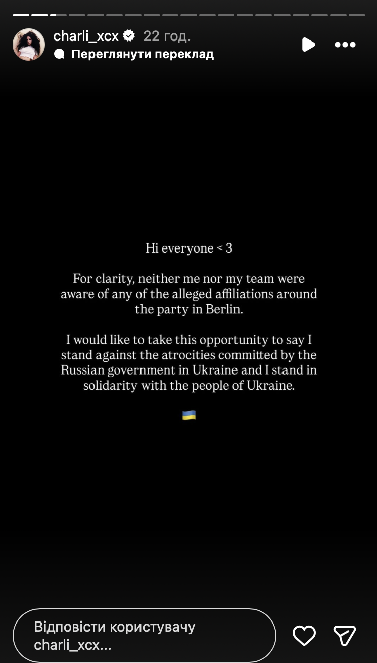 Шарлотта заявила, що ні вона, ні її команда не знали про проросійські зв’язки організаторки вечірки після прем’єри фільму в Берліні. Ба більше, Charli XCX вперше публічно підтримала Україну.