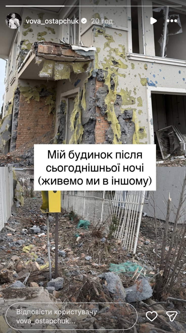 В Instagram Володимир показав фото пошкодженої нерухомості, наголосивши, що він із сім'єю наразі живе в іншому будинку, тому вони в безпеці.