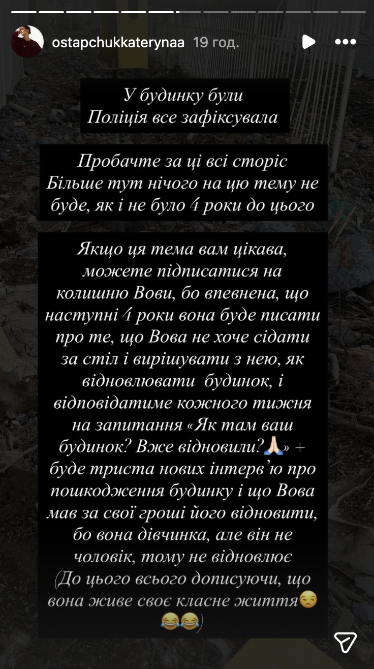 Тим часом Катерина Остапчук емоційно відреагувала на ситуацію. За її словами, зовсім нещоавно на будинок був покупець, але угода не відбулася начебто через відмову Горняк погодитися на запропоновану ціну.
