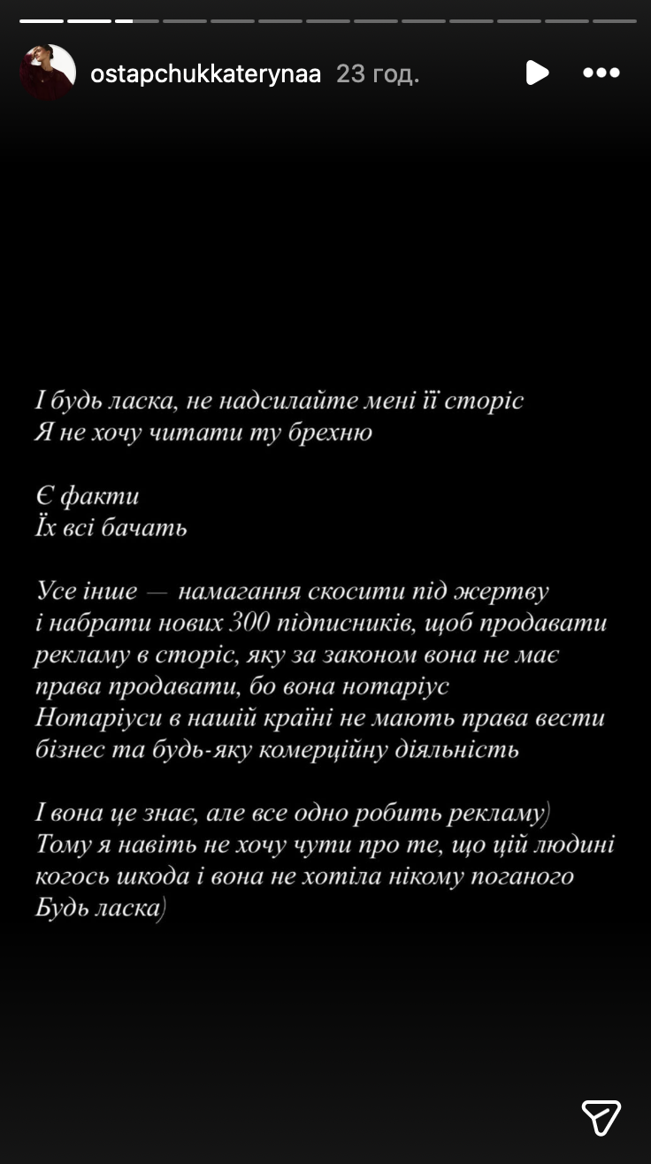 Зокрема, дружина Остапчука звинуватила Горняк у тому, що та робить реклами у своїх соцмережах, хоча як нотаріус не має права таким займатися.