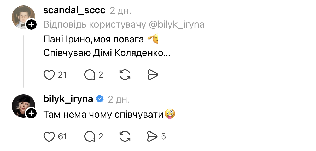 На своїй сторінці в соцмережі Threads 55-річна Білик відреагувала на грубе запитання одного з користувачів щодо особистого життя. Співачка не розгубилася і з гумором заявила, що в кожних стосунках ініціативу брала на себе: "Спокійно, малята, гатила всіх я!".