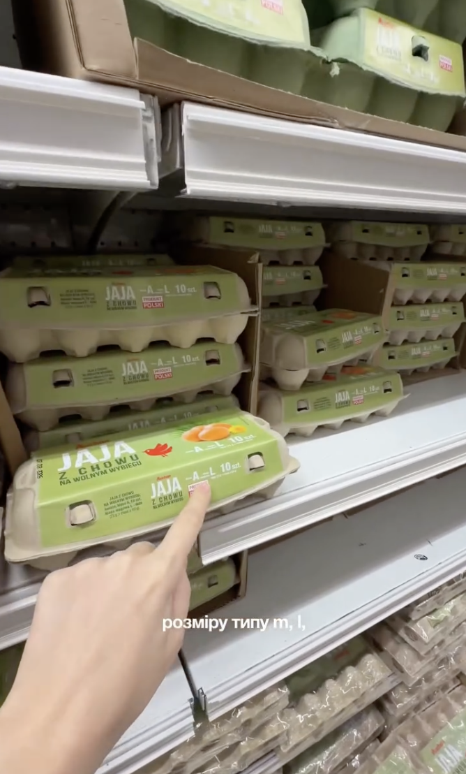 "А от з яйцями тут взагалі прикол. Окрім того, що є яйця різного розміру — м, л. Тут яйця ще й діляться на: "знесла курка, яка була лише в сараї" і "знесла курка, яка була в сараї і виходила на вулицю". Десять яєць середнього розміру від звичайної курки — 126 грн. А від "вільної" — 145", — розповіла Богдана.