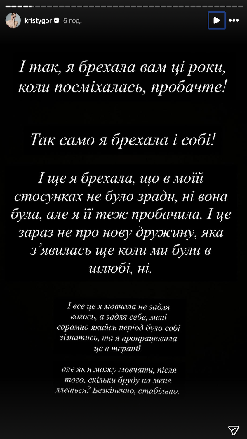 Окремо Горняк заявила, що у шлюбі була і зрада, про яку вона раніше не говорила відкрито. Водночас вона підкреслила, що не звинувачує нову дружину Остапчука, але закликала сторонніх осіб не втручатися у її приватне життя та професійну діяльність.