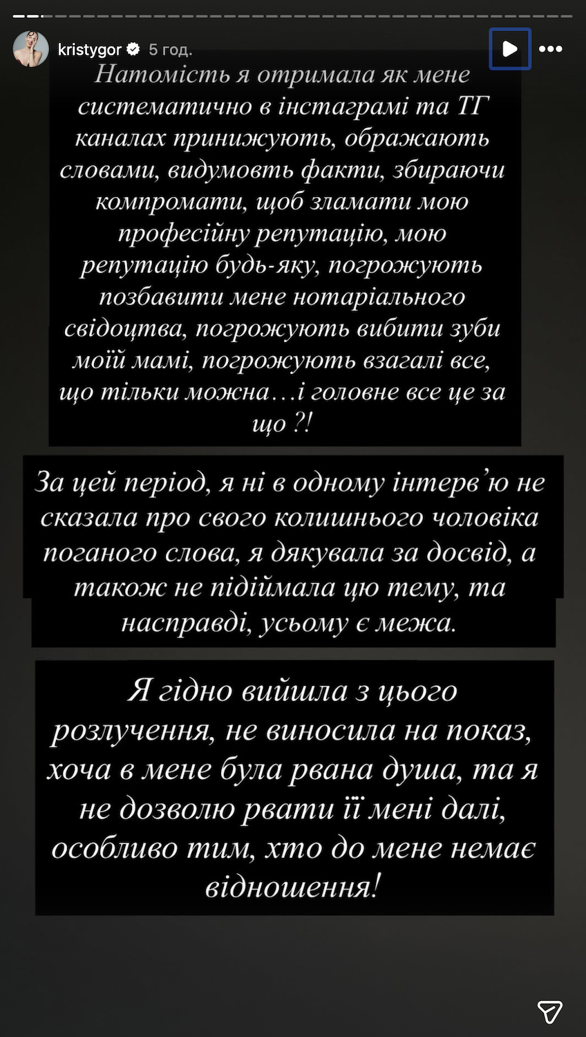 Горняк стверджує, що протягом трьох років терпіла емоційне знущання, але зрештою вирішила розлучитися, аби "врятувати свою психіку та емоційний стан". Вона також зазначила, що після розриву нібито зіткнулася з хвилею публічних образ, погроз та спроб дискредитувати її професійну репутацію в соцмережах. Про це вона розповіла в сториз в Instagram.