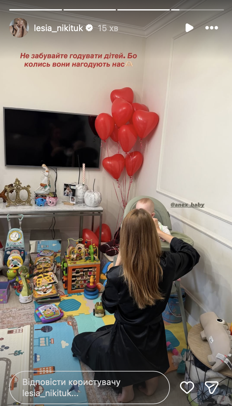 Зокрема, на знімку видно кілька кульок у формі червоних сердець та багато-багато іграшок маленького Оскара, який зʼявився на світ минулого літа і став сюрпризом для фанатів Лесі Нікітюк, яка приховувала вагітність буквально до останнього моменту.