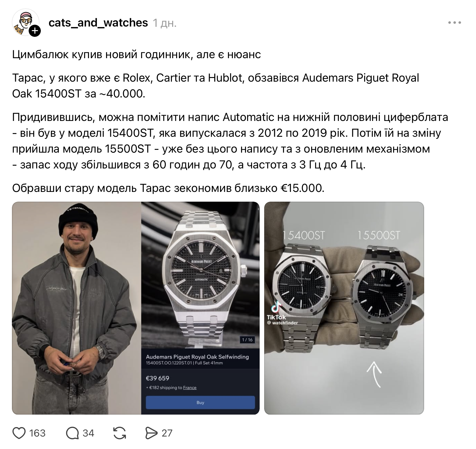 Водночас у Threads-акаунті cats_and_watches звернули увагу на деталі циферблата: напис Automatic у нижній частині вказує, що це модель 15400ST, яку випускали у 2012–2019 роках. Пізніша версія 15500ST такого напису не має та отримала оновлений механізм із більшим запасом ходу — 70 годин замість 60 і частотою 4 Гц замість 3 Гц. За підрахунками користувачів, обравши старішу модель, актор міг заощадити приблизно 15 тисяч євро.