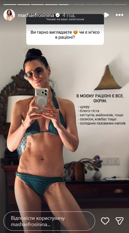 Приводом для публікації фото стало запитання від підписників: чи є у її раціоні м’ясо? Відповідь виявилася максимально простою — так, у меню Єфросиніної є все. Водночас вона наголосила, що свідомо виключила продукти, які не приносять користі організму.