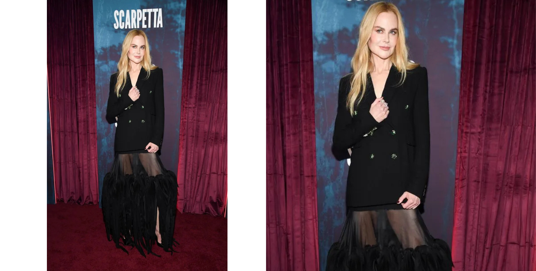 Акторка з’явилася на прем’єрі у сміливому чорному образі — структурованому піджаку, який вона одягла без спіднього, та напівпрозорій спідниці з прозорими вставками і подолом, оздобленим пір’ям.