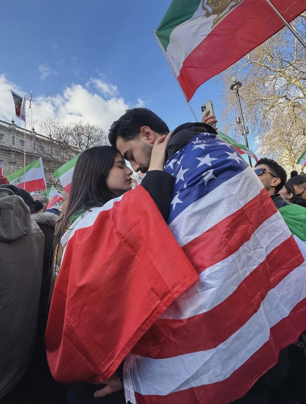 Цікаво, що під час одного з протестів модель накинула на плечі прапор Ірану, пригорнувшись до свого чоловіка Сепехра Акбарі, який був у прапорі США.