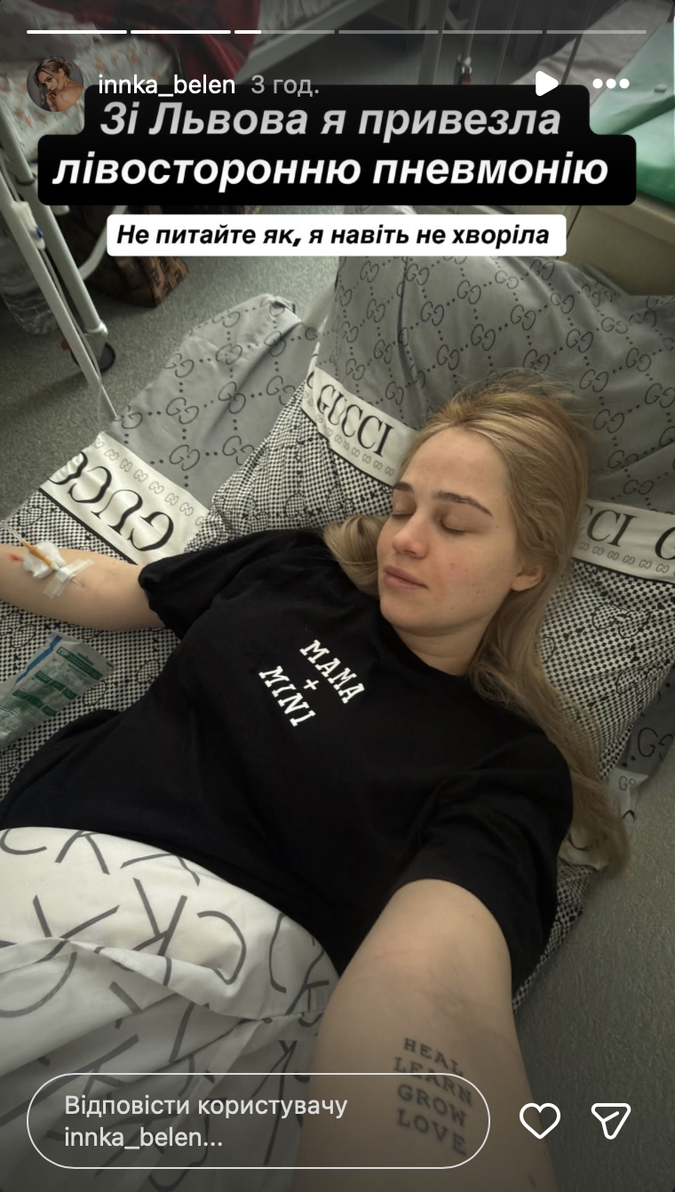 "Зібрала сили в купу, 4 дні мене тут не було не просто так… Мені вже легше, тому можу розповісти. Госпіталізація, тому що зі Львова я приїхала не сама. З Львова я привезла лівобічну пневмонію", — розповіла Бєлєнь.