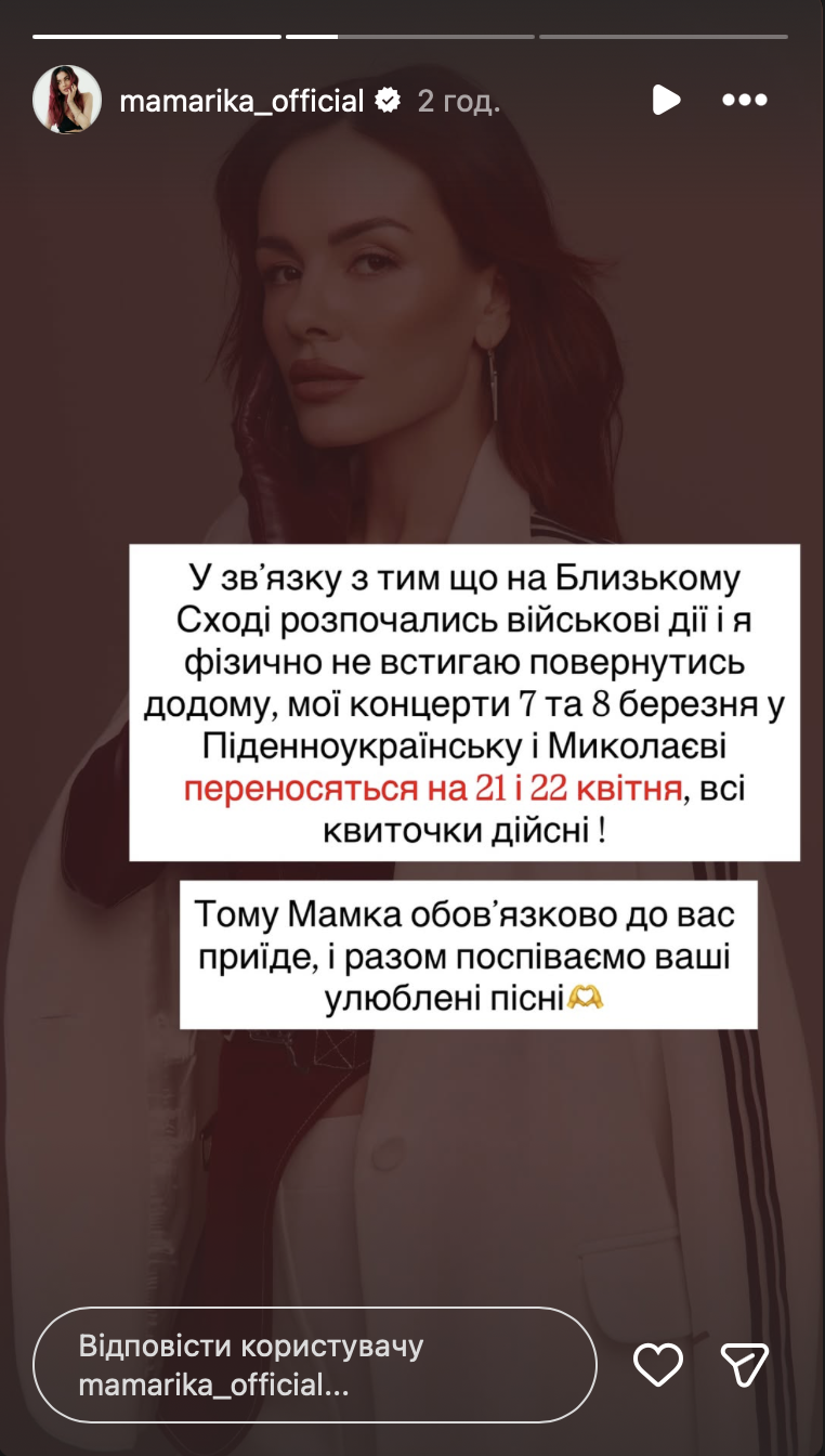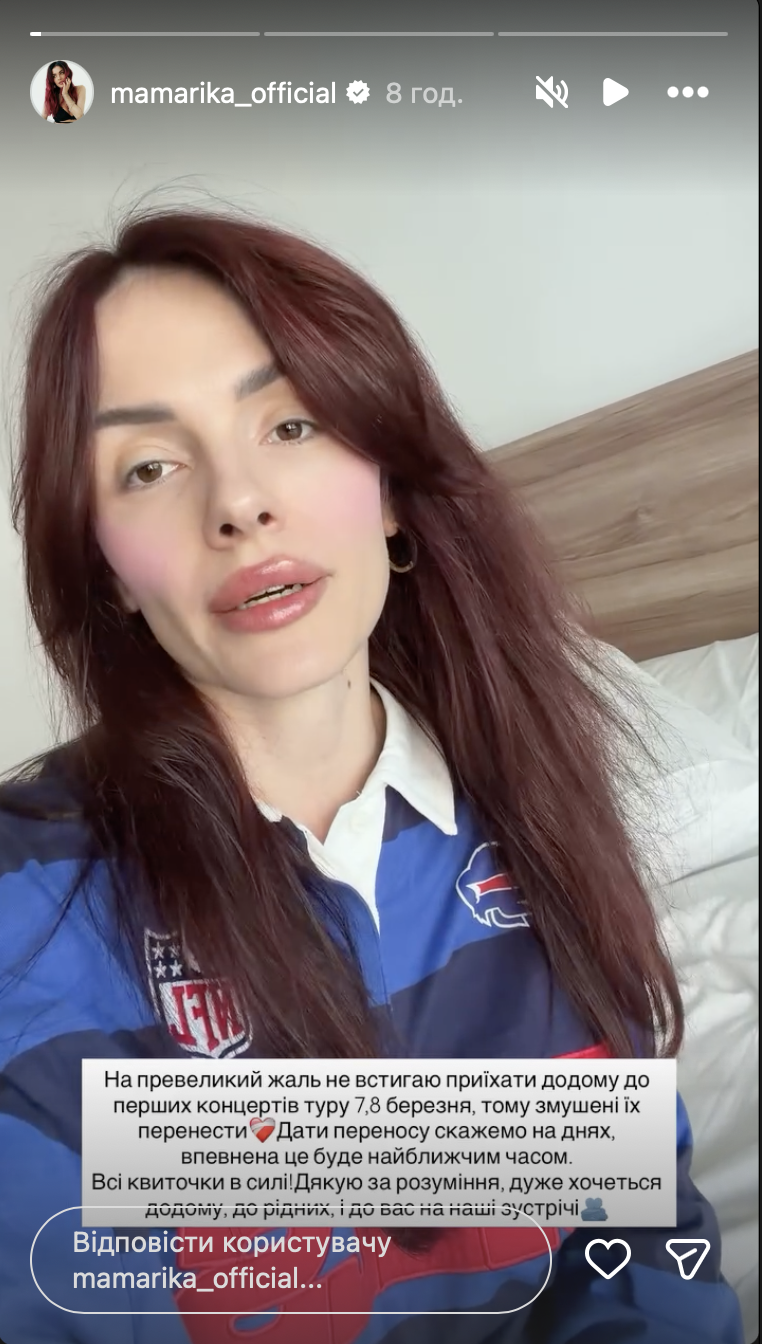 "На превеликий жаль, не встигаю приїхати додому до перших концертів 7,8 березня, тому змушені їх перенести… Знаю, що ви хвилюєтеся, ситуація така: ми ще досі тут, з дня на день чекаємо виліт, кожен день він переноситься, постійно переноситься… Ми вже шукаємо різні варіанти", — повідомила артистка 6 березня.
