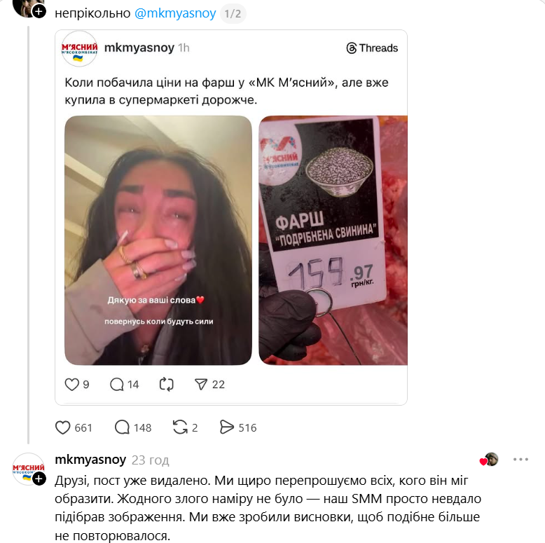 М’ясокомбінат "МК М’ясний" опублікував у Threads жартівливий пост про ціни на фарш. У ньому використали колаж: з одного боку — фото фаршу з цінником, а з іншого — скрин сториз Єви Мішалової, де вона плаче та дякує підписникам за підтримку. Сторіс супроводжувалася текстом: "Дякую за ваші слова. Повернусь, коли будуть сили".