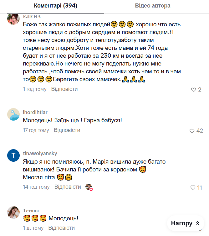• Інша додає: "Яка красива бабуся, яке світле обличчя, прикро, що про таких не піклується держава".