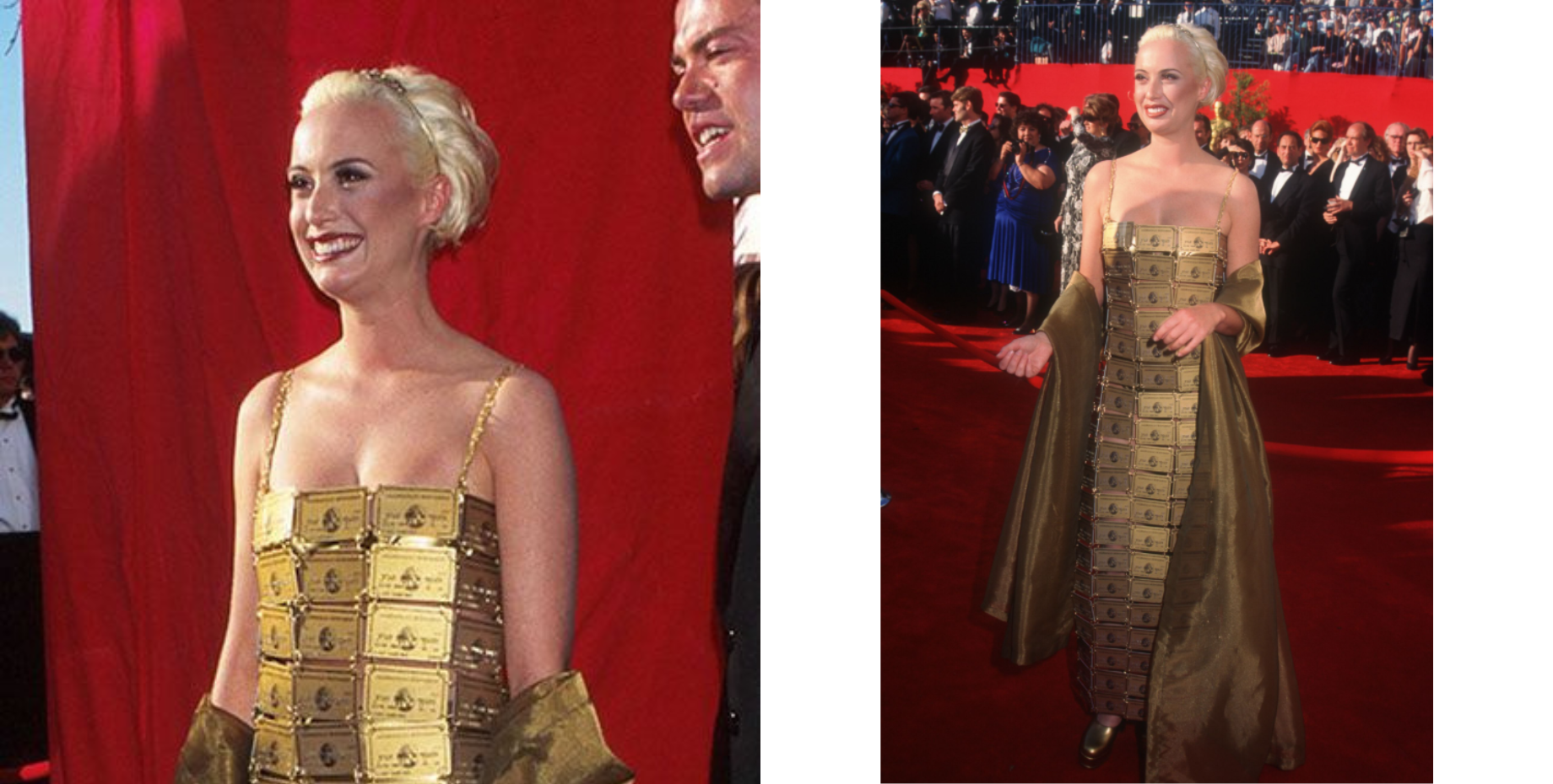 Її сукня була зроблена з 254 золотих карток American Express, які були з’єднані між собою дротом. Вбрання виглядало футуристично і водночас провокаційно. Воно одразу викликало хвилю критики та обговорень.