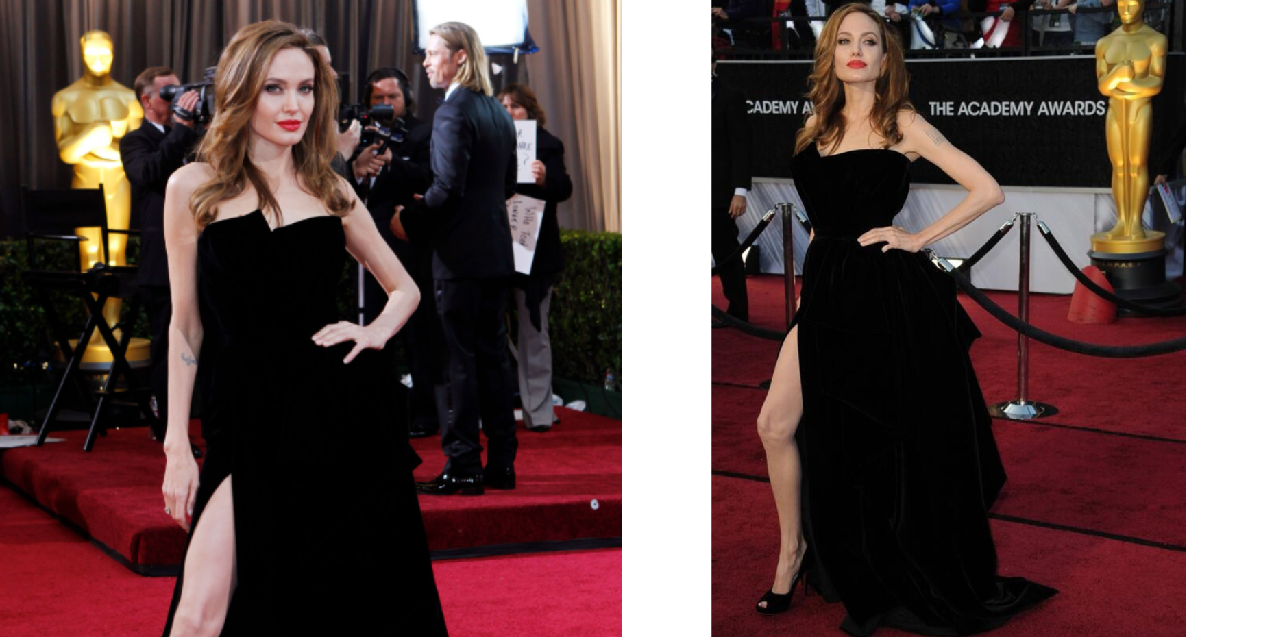 Акторка прийшла у чорній сукні Atelier Versace з високим розрізом на стегні. Але справжнім інтернет-феноменом стала її поза на червоній доріжці: Джолі демонстративно виставляла вперед праву ногу, підкреслюючи розріз сукні.