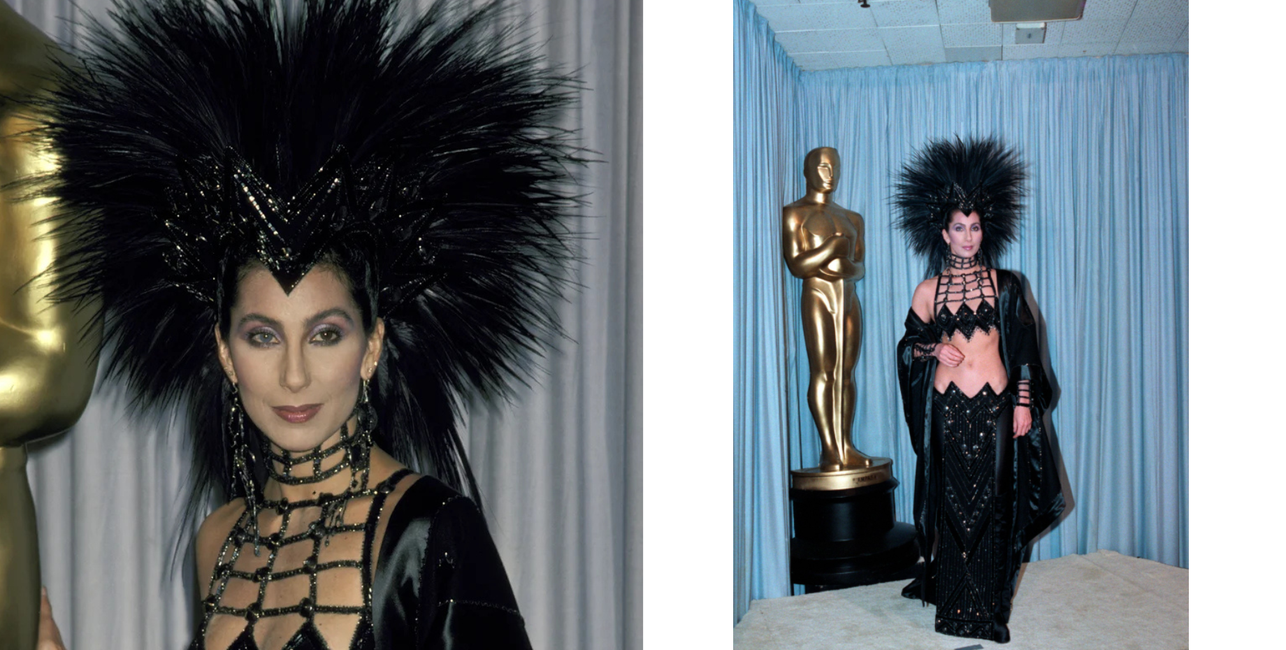 Королева театральності Шер безумовно стала головною зіркою червоної доріжки "Оскара" у 1986 році. Вона з’явилася у сміливому образі від свого давнього друга і дизайнера Боба Маккі. Це була чорна сукня, розшита блискітками, яка відкривала живіт, а завершував образ величезний головний убір з пір’ям.