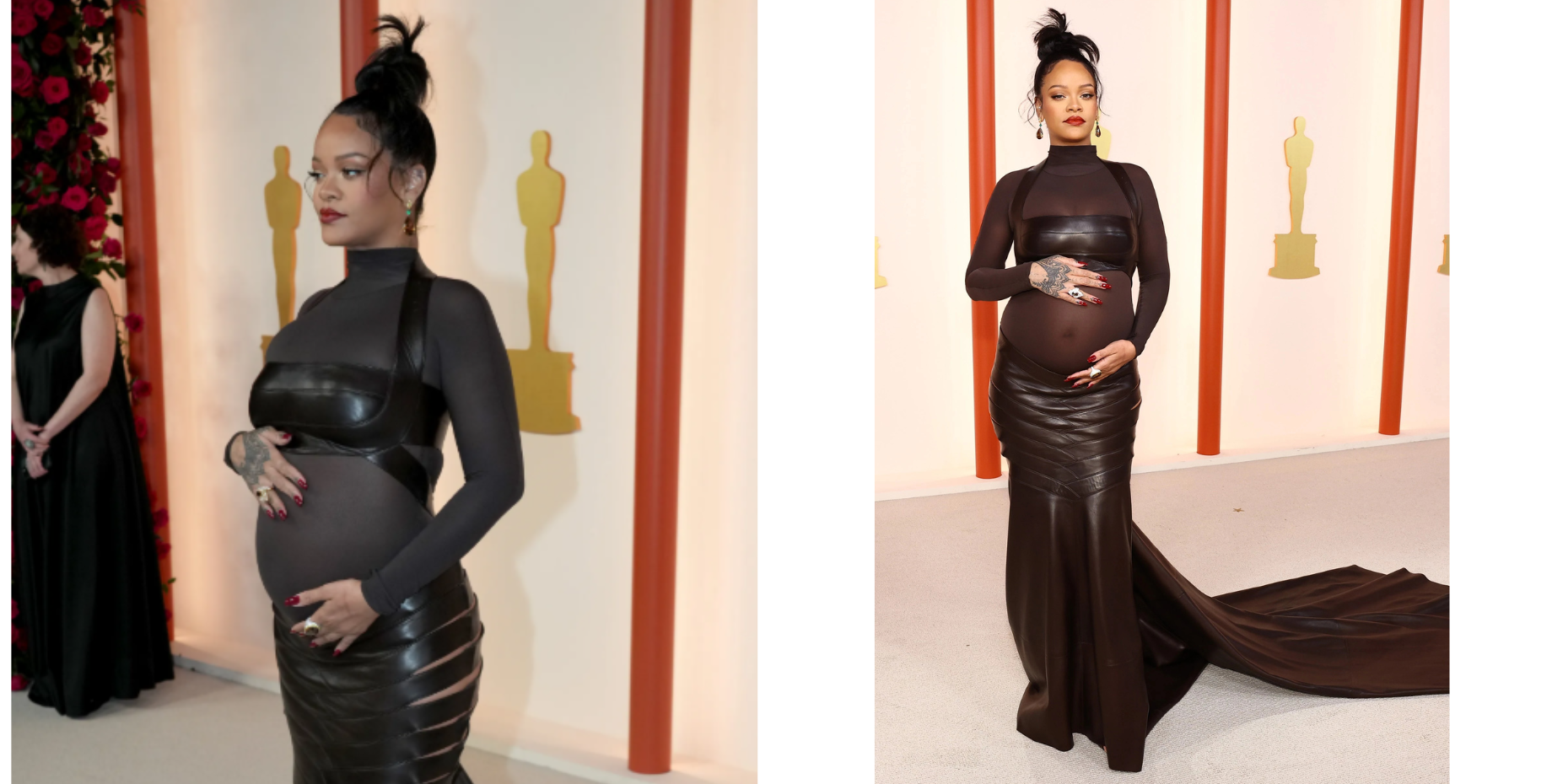 Коли Ріанна з’явилася на "Оскарі" у 2023 році, інтернет буквально вибухнув обговореннями її образу. Співачка прийшла на церемонію у прозорій сукні Alaïa, що облягала фігуру, з шкіряними деталями.