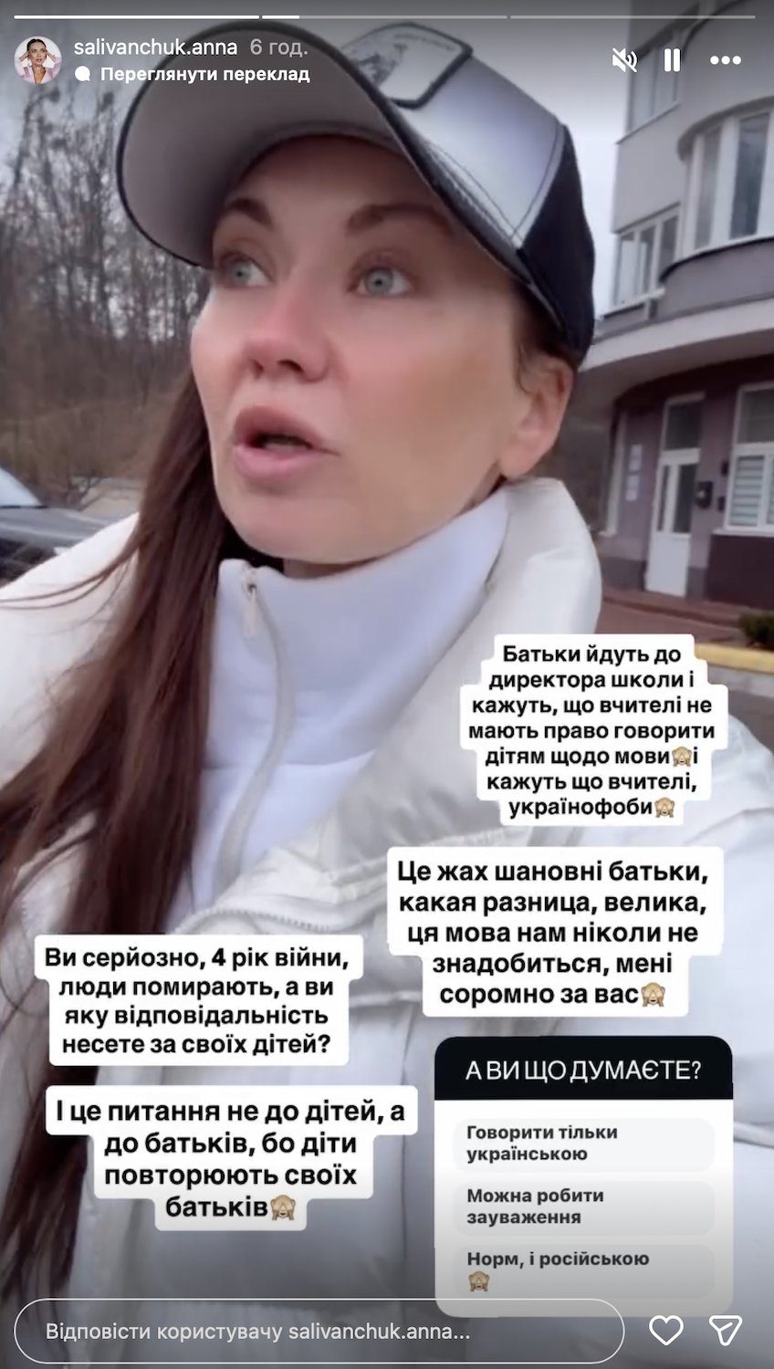 "Підходжу до вчителів, кажу, що потрібно ставити їм якісь двійки, давати домашні завдання, щоб вони розуміли, що так просто не можна. І що мені кажуть вчителі? Що батьки наших учнів йдуть до директора школи і кажуть, що так не можна і що діти мають право говорити російською. Що? Дорогі батьки, особливо наші однокласники, ви можете мене ненавидіти, але ні! Четвертий рік війни і "яка різниця"? Велика! Люди вмирають!" – зазначила артистка.