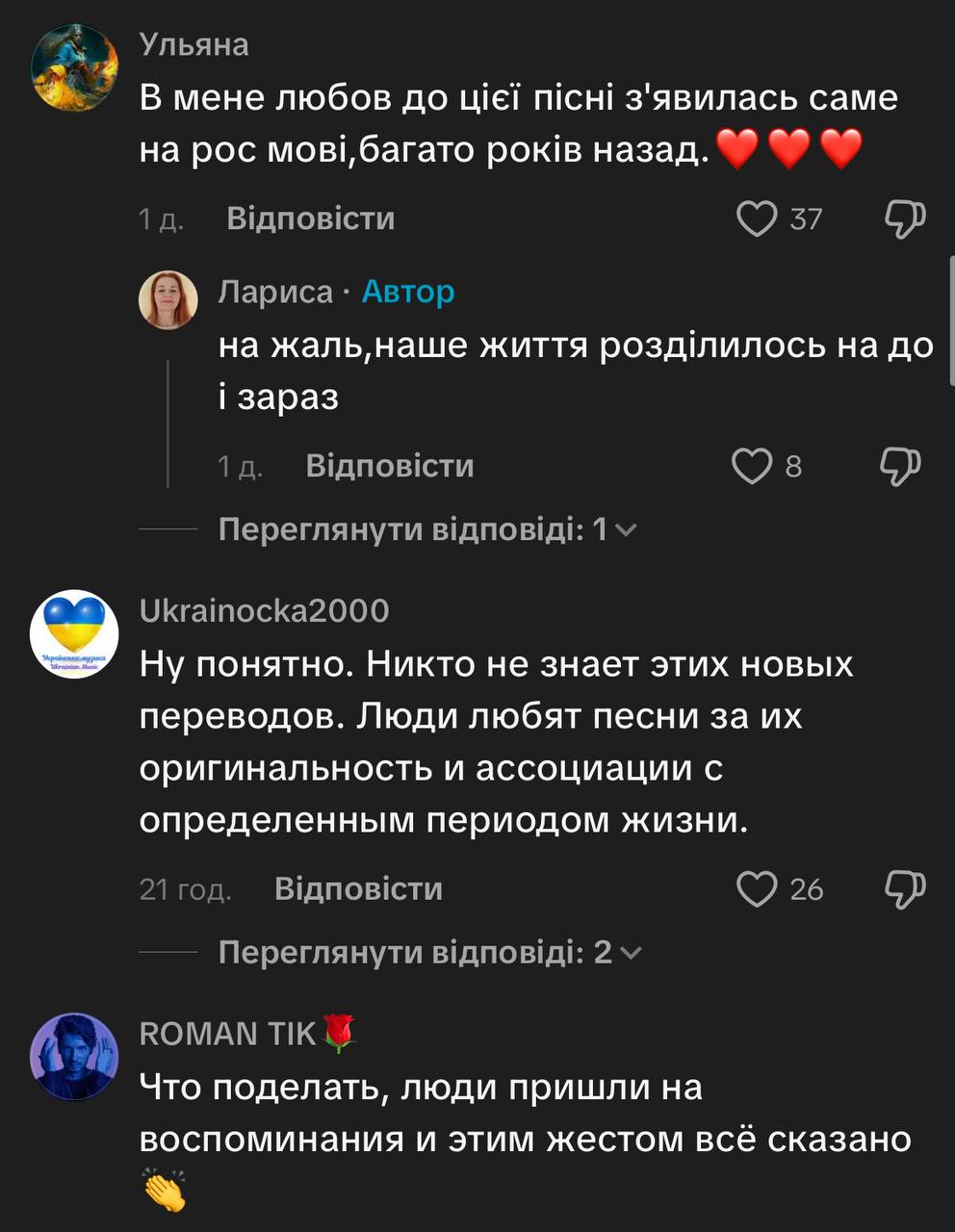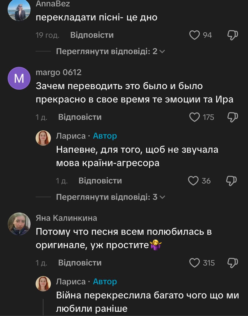 - "Зрозуміло, що ніхто не знає нових перекладів — люди люблять пісні за їхню оригінальність і асоціації з певним періодом життя"