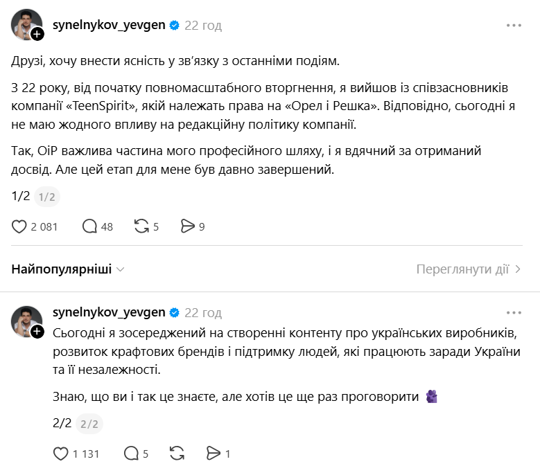За його словами, "Орел і Решка" була важливою частиною професійного шляху, однак цей етап для нього давно завершений. Також він додав, що нині зосереджений на створенні контенту про українських виробників, розвитку крафтових брендів і підтримці людей, які працюють заради України та її незалежності, і підкреслив, що хотів ще раз це проговорити, хоча аудиторія й так це знає.